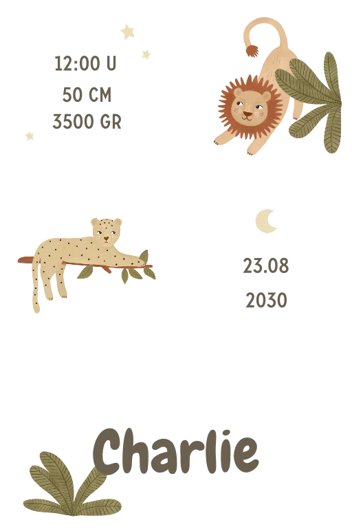 Dit is een lieve set van houten blokken. De blokken hebben een jungle thema. Ook zijn op de blokken de geboortegegevens van het kleintje te zien. De blokken kunnen naar wens aangepast worden in onze online opmaaktool.