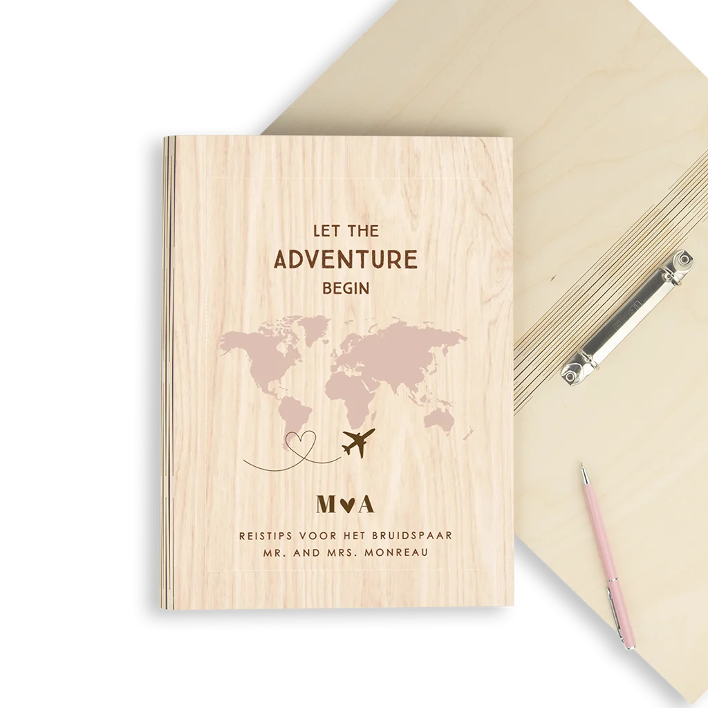 Gaat er binnenkort iemand trouwen? Doe het bruidspaar deze mooie houten bewaarbundel cadeau! De bewaarbundel is gemaakt van multiplex hout in A4 formaat en heeft een accordeon rug. Je kunt de voorzijde van de bundel naar wens personaliseren in de editor en thuis zelf vullen met bijvoorbeeld reistips.