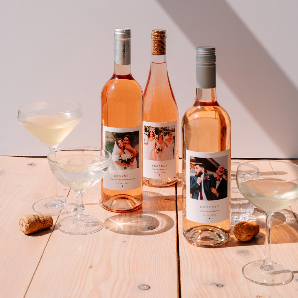 Zoek je een origineel cadeau om jullie ceremoniemeester en getuigen te bedanken? Met deze gepersonaliseerde wijnetiketten verras je de getuigen op jullie huwelijk met hun (of jullie!) favoriete wijn. Hoe leuk! Je hoeft de labels thuis alleen nog op de fles te plakken.