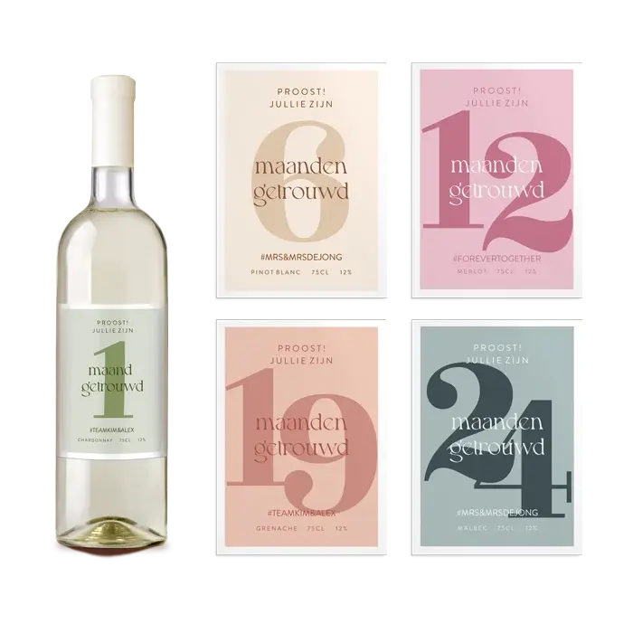 5 unieke wijnetiketten als huwelijkscadeau typografisch in pastelkleuren