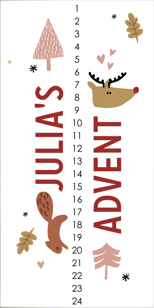 Sfeervolle advent pilaarkaars met moderne, speelse Scandi illustraties. Het ontwerp met rendier, eekhoorn, bomen en sterretjes in roest- en baksteenrood, okergeel, blush en diep donkerblauw op witte basiswas is voorzien van cijfers 1–24 om af te tellen tot Kerstmis. Prachtig als kerstcadeau of warme winterdecoratie.