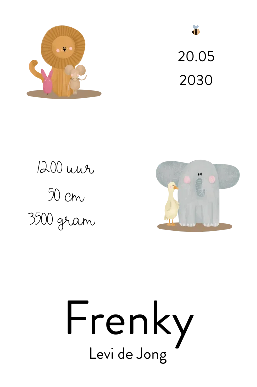 Dit is een lieve set van houten blokken. De blokken hebben een dieren thema. Ook zijn op de blokken de geboortegegevens van het kleintje te zien. De blokken kunnen naar wens aangepast worden in onze online opmaaktool.