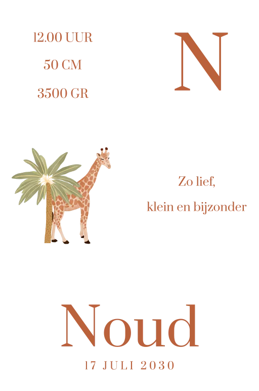 Unieke set van houten blokken. De blokken zijn leuk om neer te zetten in de babykamer. De giraf en palmboom staan op elk kamertje en is unisex. Op het grootste blok kan de naam van het kleintje en de geboortedatum gedrukt worden. De blokken kunnen naar wens aangepast worden in onze online opmaaktool.