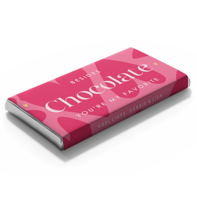 Chocoladereep met eigen wikkel in roze met donkerroze hartjes