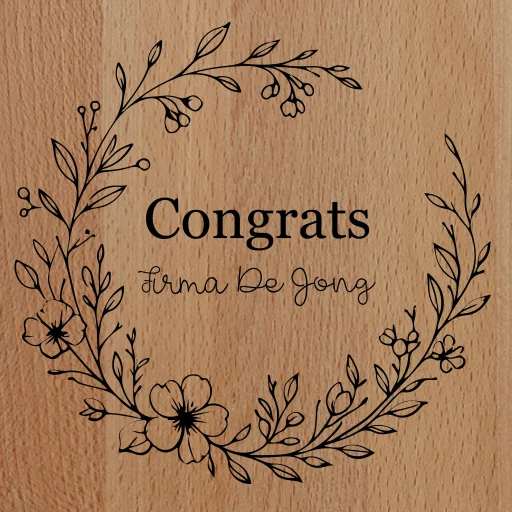 Een uniek jubileum wenskaartje met gegraveerde bloemenkrans. Pas het ontwerp naar wens aan in onze online editor. Let op: Tekst en afbeeldingen lijken zwart op het voorbeeld, maar worden donkerbruin gegraveerd. Er wordt geen kleur gedrukt.
