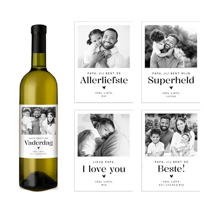 Is jouw vader(figuur) een echte wijn liefhebber? Verras hem deze Vaderdag met een gepersonaliseerde wijnfles! Je past gemakkelijk het design aan met de online editor en kunt de etiketten thuis zelf op zijn favoriete wijn plakken.