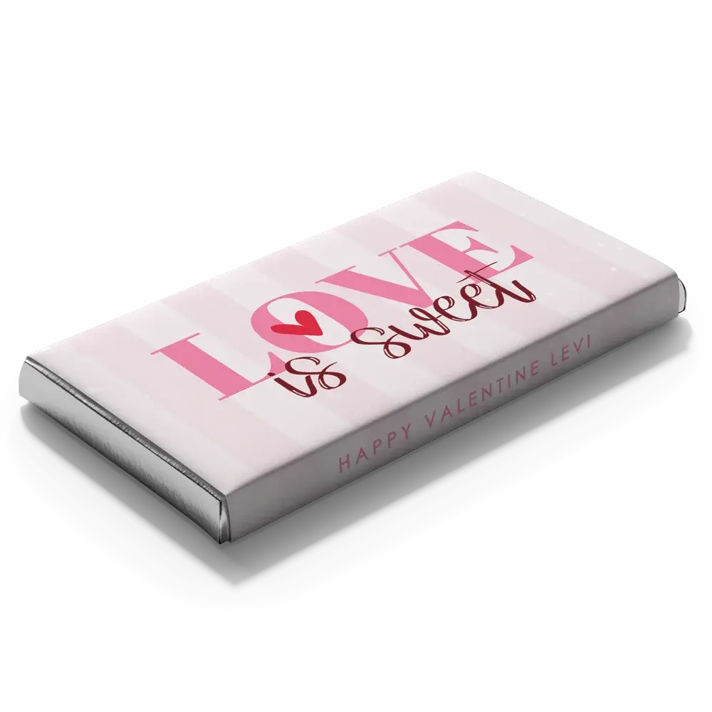 Chocoladereep met eigen wikkel valentijn typografisch in roze tinten