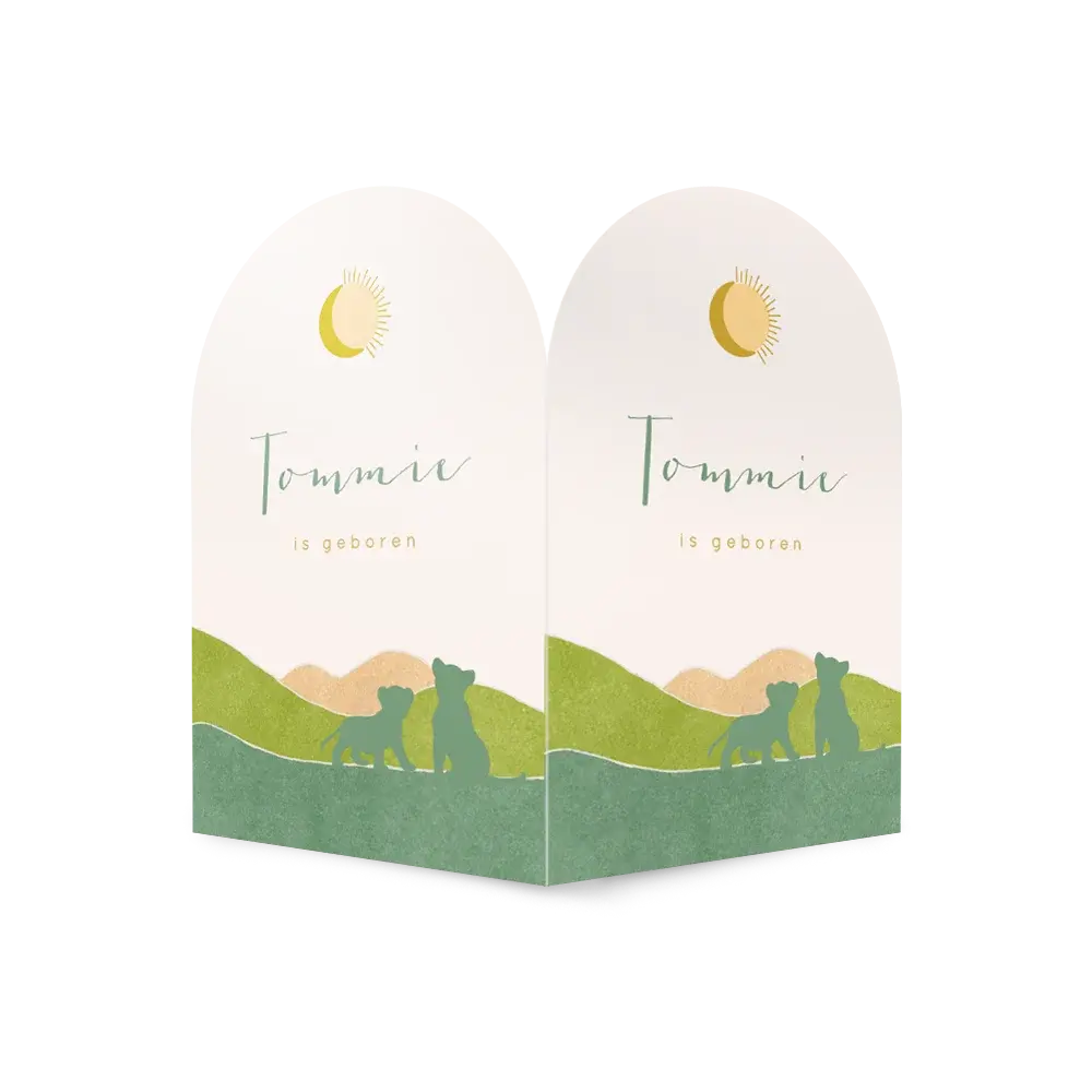 Je kunt dit geboortebord met groen heuvellandschap en welpjes naar wens bewerken in onze editor, pas zelf de kleuren of lettertypes aan.