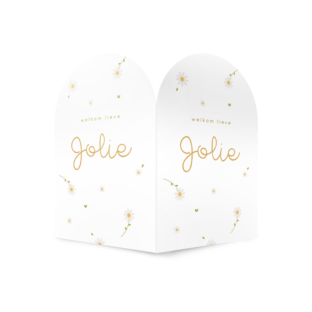 Je kunt dit geboortebord met schattige madeliefjes naar wens bewerken in onze editor, pas zelf de kleuren of lettertypes aan.