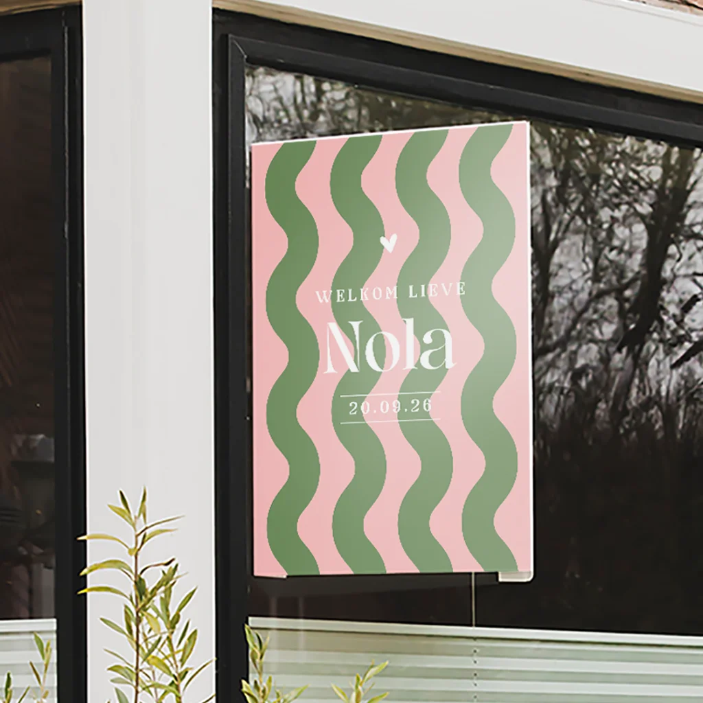 Maak de geboorte van jullie kleintje bekend met dit roze geboorte raambord met golvend groen patroon! Bewerk het bord gemakkelijk in onze editor.