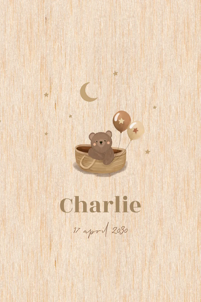 Ben je op zoek naar een bijzonder geboortekaartje voor je kleintje? Ga voor dit houten kaartje met ronde hoeken en beertje in mand. Iets aanpassen? Dat doe je gemakkelijk met de online editor.