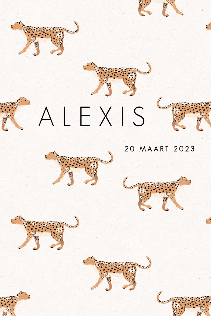 Een avontuurlijk geboortekaartje meisje met een patroon van panters.