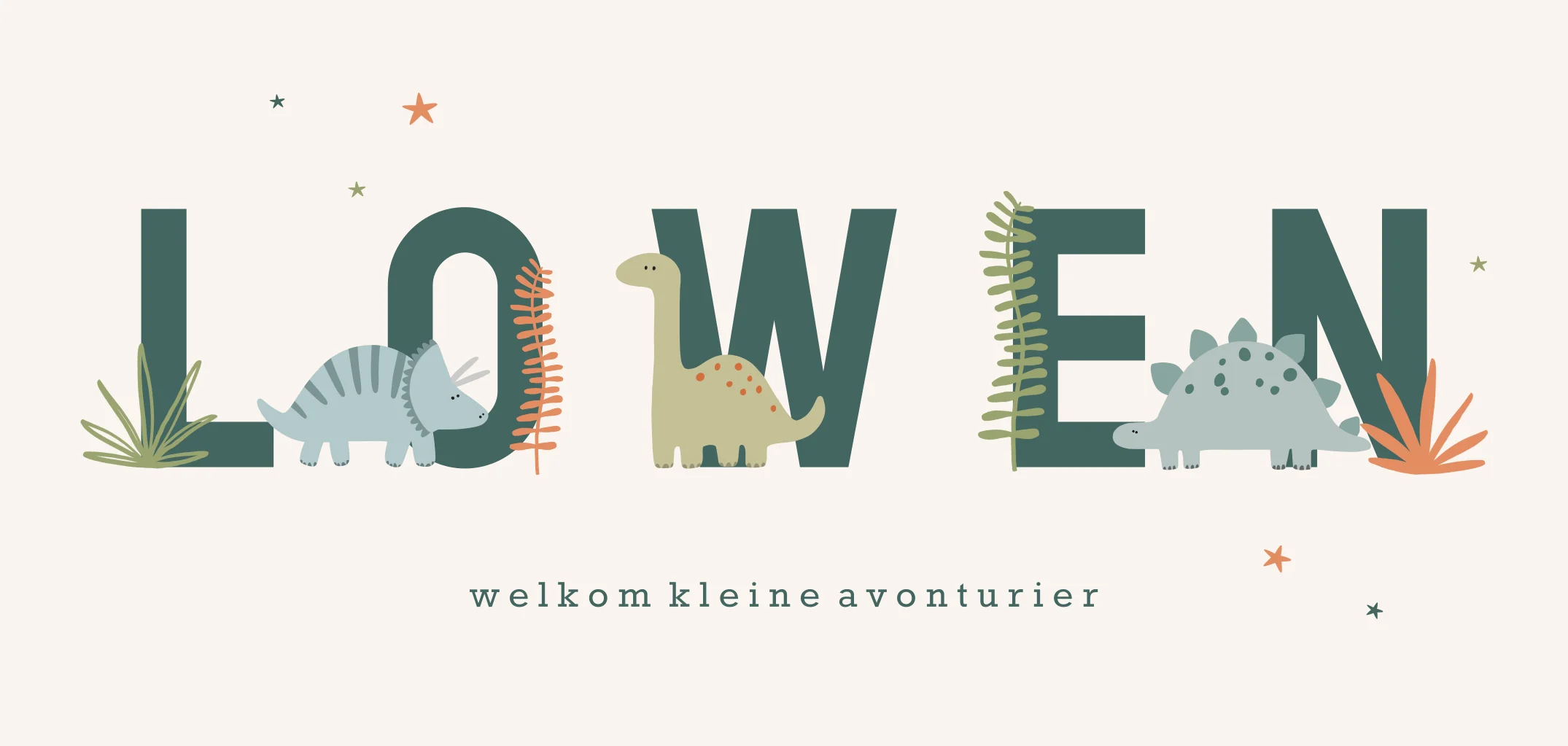 Wat een stoer geboortekaartje is dit, wij zijn er helemaal weg van. Het geboortekaartje heeft een speelse uitstraling door de vrolijke dino illustraties. Wist je dat ronde hoeken ook heel mooi bij dit kaartje passen? Bekijk het zelf door het aan te passen in de editor.