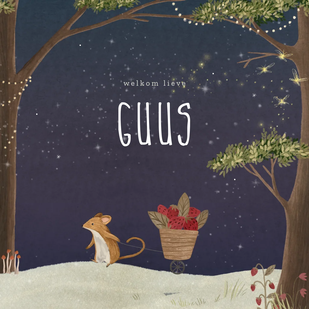 Ga op avontuur en kies voor een geboortekaartje uit waarbij dit nachtelijke doorkijkje de hoofdrol speelt. Op het kaartje zie je een muisje met aardbeien in het bos. De sterrenhemel, vuurvliegjes en lampjes maken dit kaartje super sfeervol. De goudfolie geeft een luxe finish.
