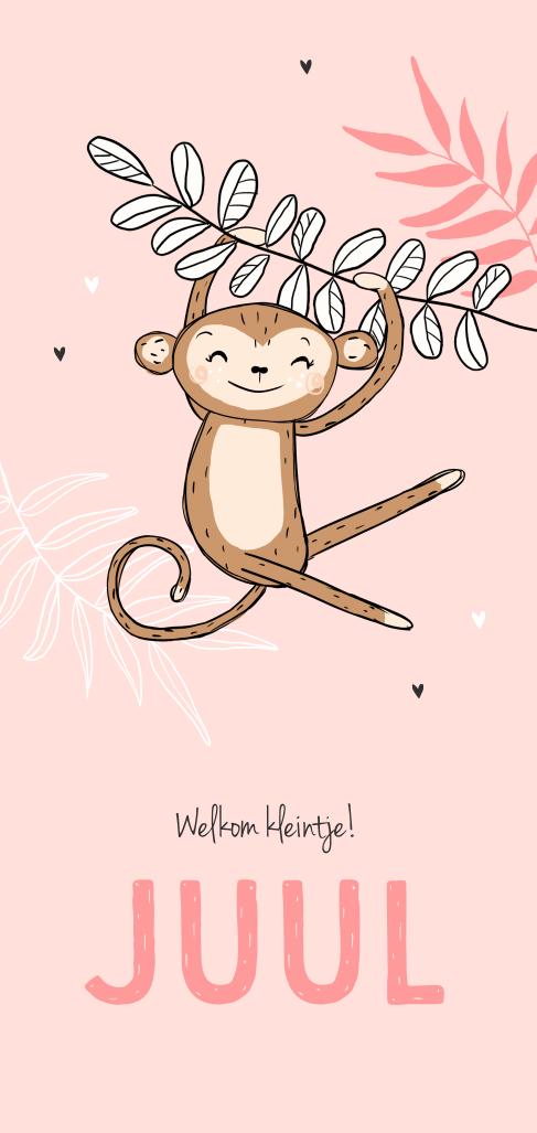 Een avontuurlijk maar ook lief geboortekaartje meisje met aapje. Zachte roze kleuren en een prachtige illustratie van een aap. Kies je favoriete papiersoort en maak een proefdruk.