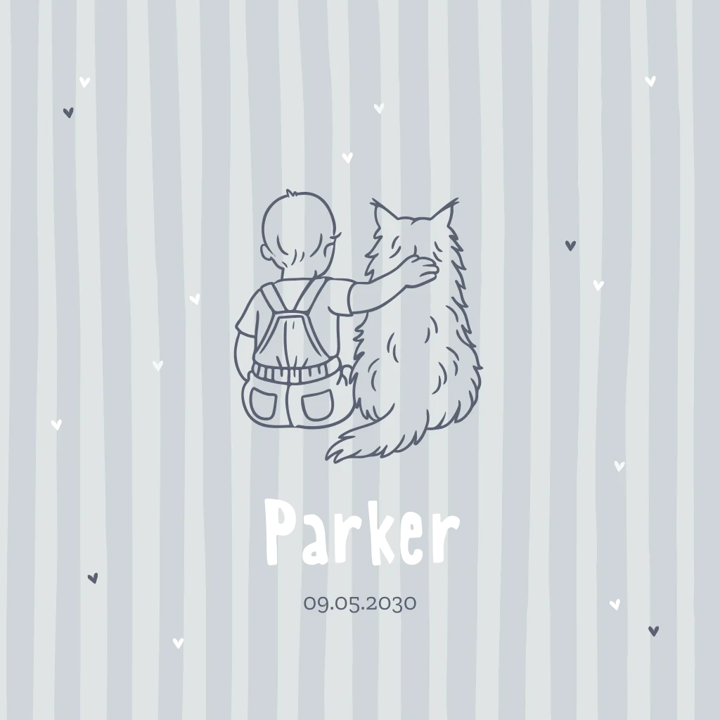 Een lief blauw geboortekaartje met strepen voor jouw kindje. Het vierkante kaartje heeft een schattige lijntekening van een kindje naast een hond. Je past de de illustratie gemakkelijk zelf aan naar de juiste hond of kat met de verschillende opties in onze editor. Staat jullie huisdier er niet tussen? Neem dan gerust even contact met ons op via deze link. Dan kijken we graag samen naar de mogelijkheden!
