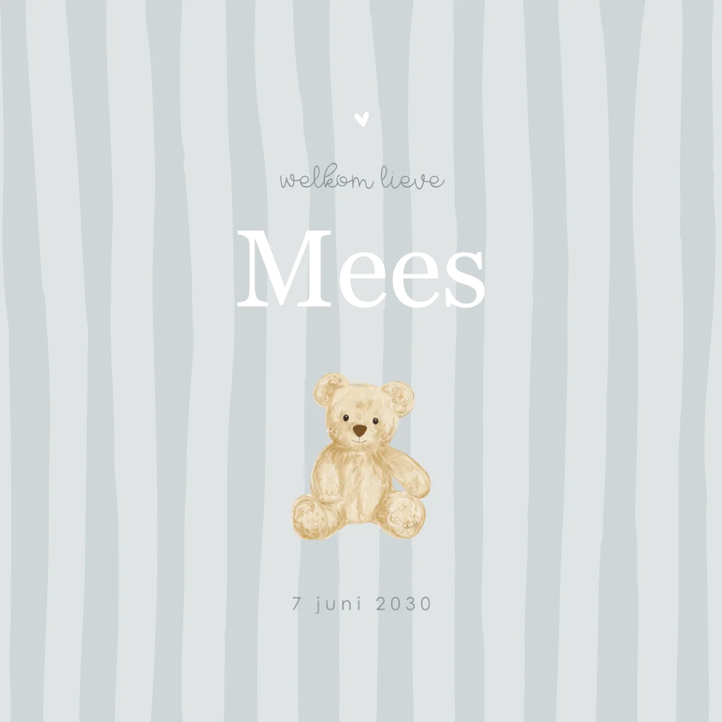 Wat een lief geboortekaartje voor jullie zoontje. Dit kaartje heeft mooie blauwe strepen en een lief teddybeertje op de voorgrond. De goudfolie naam en accenten geven dit kaartje een extra unieke uitstraling. Pas de kleuren en tekst eenvoudig aan in de online editor.
