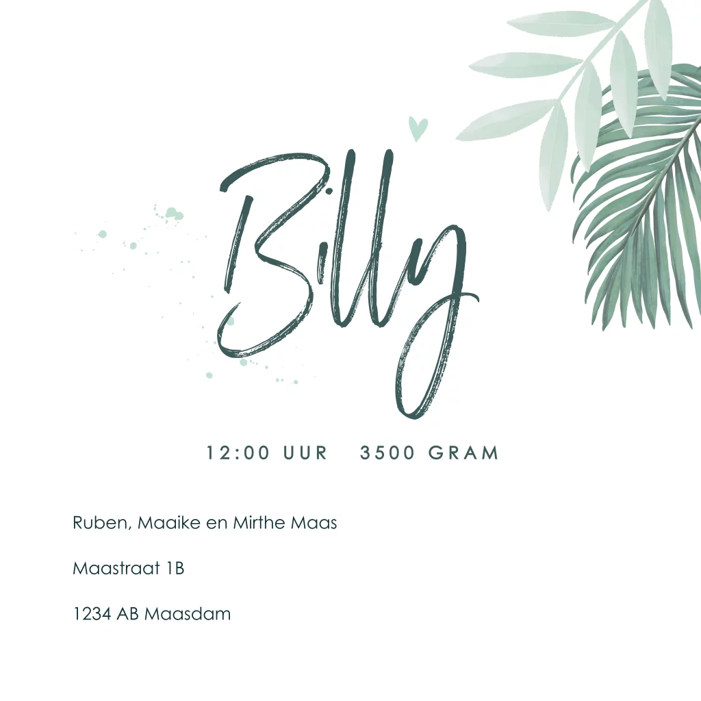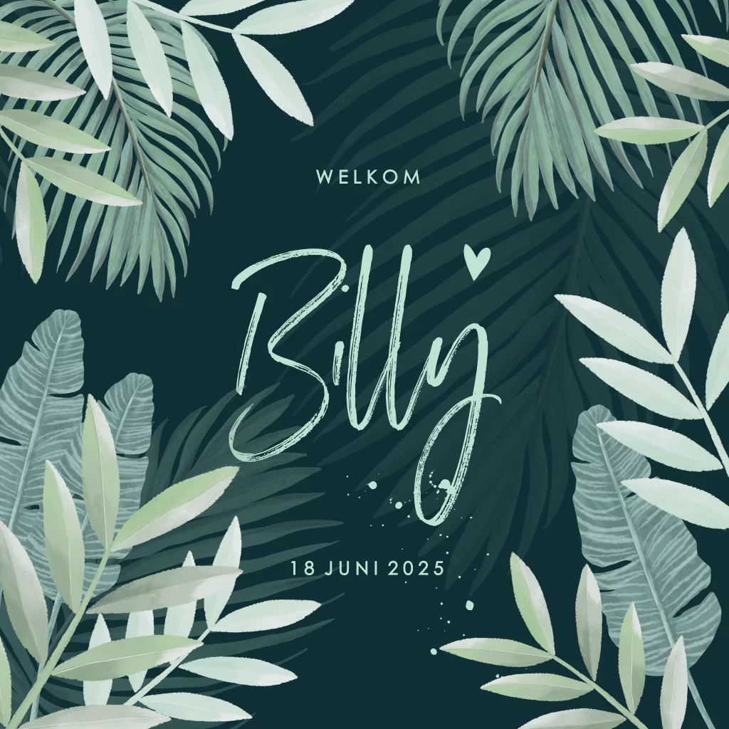 Ga voor echt bijzonder en kies voor een geboortekaartje jungle stijl! De bladeren in mooie mint kleuren maken dit kaartje uniek!