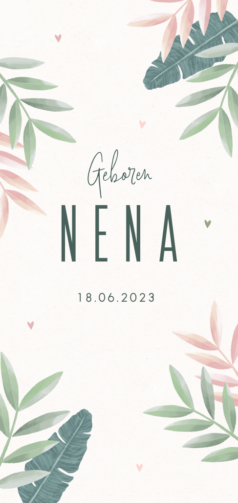 Een stoer babykaartje meisje in botanische stijl. Mooie kleuren grijsgroen en oudroze vormen voor een prachtige combinatie. Kies voor oud-hollands papier en een oudroze envelop.