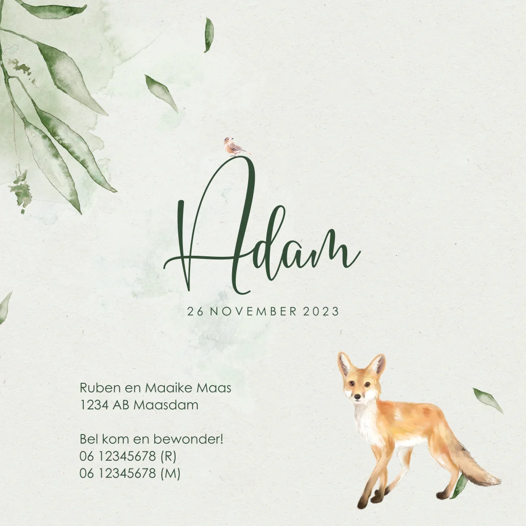 Een stoer kaartje geboorte jongen met takjes, blaadjes een vosje en een vogeltje. Aan de binnenzijde is er ruimte voor een foto van jullie kleine uk. Prachtig op oud-hollands papier en te combineren met een olijfgroene envelop.