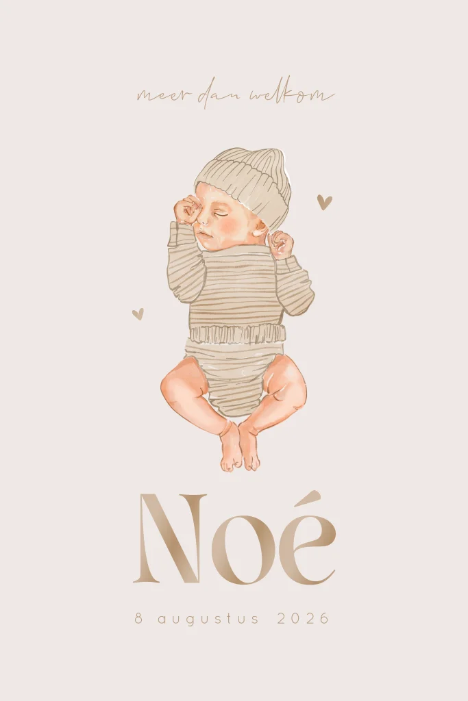Wat een superlief geboortekaartje voor een zoontje! De naam staat in trendy hoogglans letters. Erboven een mooie tekening met waterverf van een slapende baby met leuke hartjes ernaast.