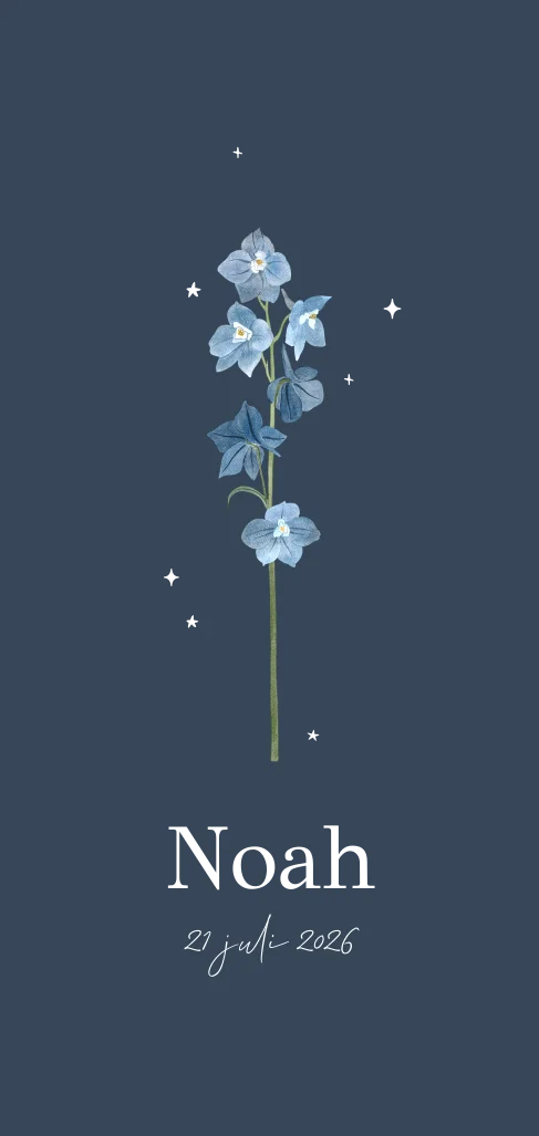 Een stijlvol kaartje in nachtblauw met een echte zomerbloem voor de maand juli: ridderspoor! Om de lichtblauwe bloem staan kleine witte sterretjes, echt lief!