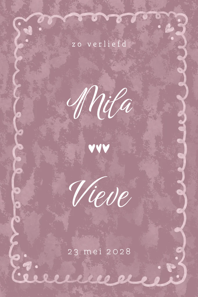Wat een onwijs lief geboortekaartje voor een tweeling! Het kader geeft een vrolijke uitstraling. Heb je de letters en hartjes in roséfolie al gezien? Dit maakt het kaartje helemaal af.