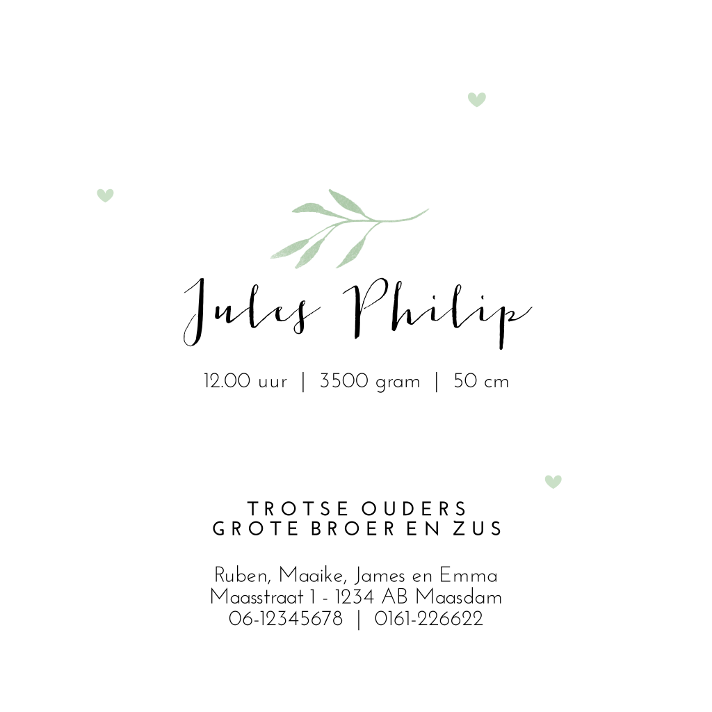 Trendy geboortekaartje jongen met groen silhouet van broer en zus