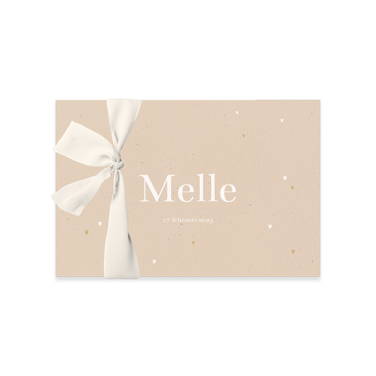 Goed om te weten: het zijden lint wordt niet standaard meegeleverd, dit kun je zelf toevoegen tijdens het bestelproces. Je vindt alle bevestigingsmaterialen hier. Wanneer je de geboortekaartjes ontvangt, kun je het lint er zelf omheen strikken.