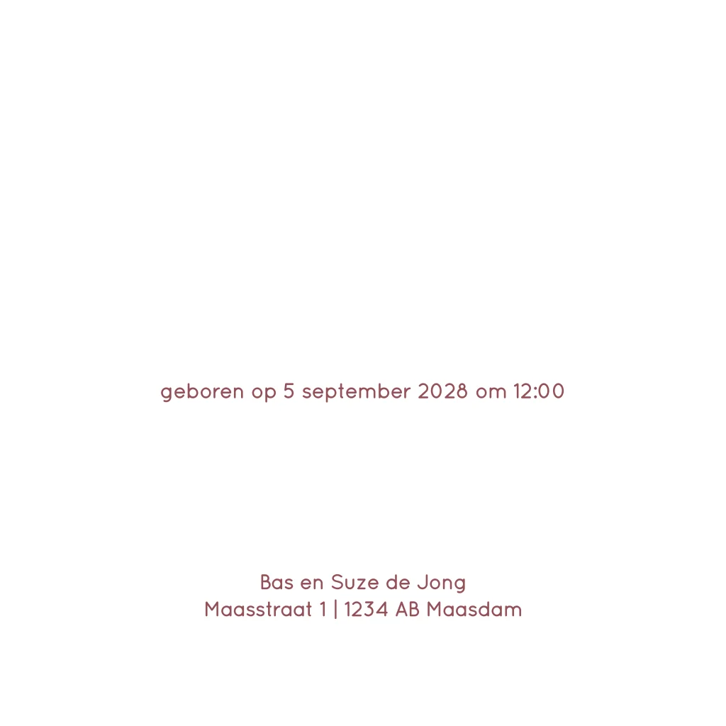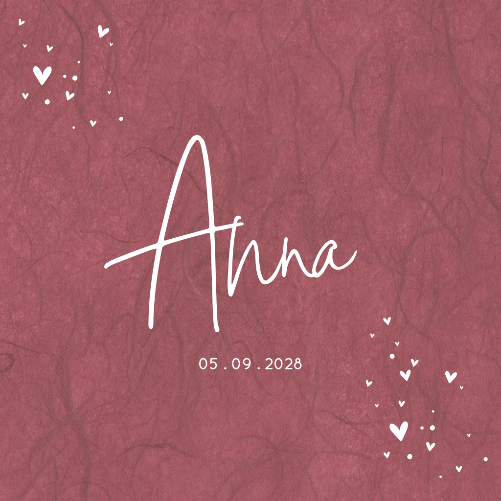 Zo mooi, dit geboortekaartje met hartjes! De donkerrode kleur in combinatie met de naam van je dochtertje in roségoudfolie maken dit kaartje extra bijzonder. Wil je iets aanpassen? Dan kan gemakkelijk met de online editor.