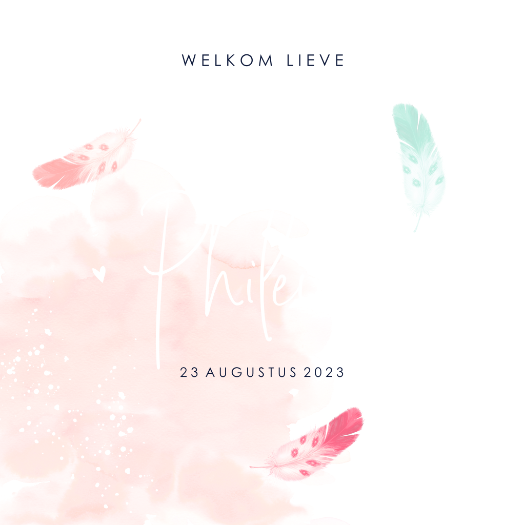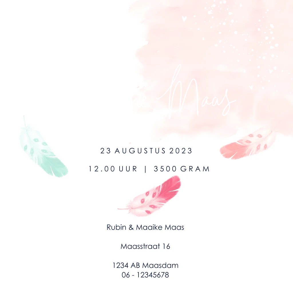 Lief roze geboortekaartje voor een meisje met veertjes en spetters