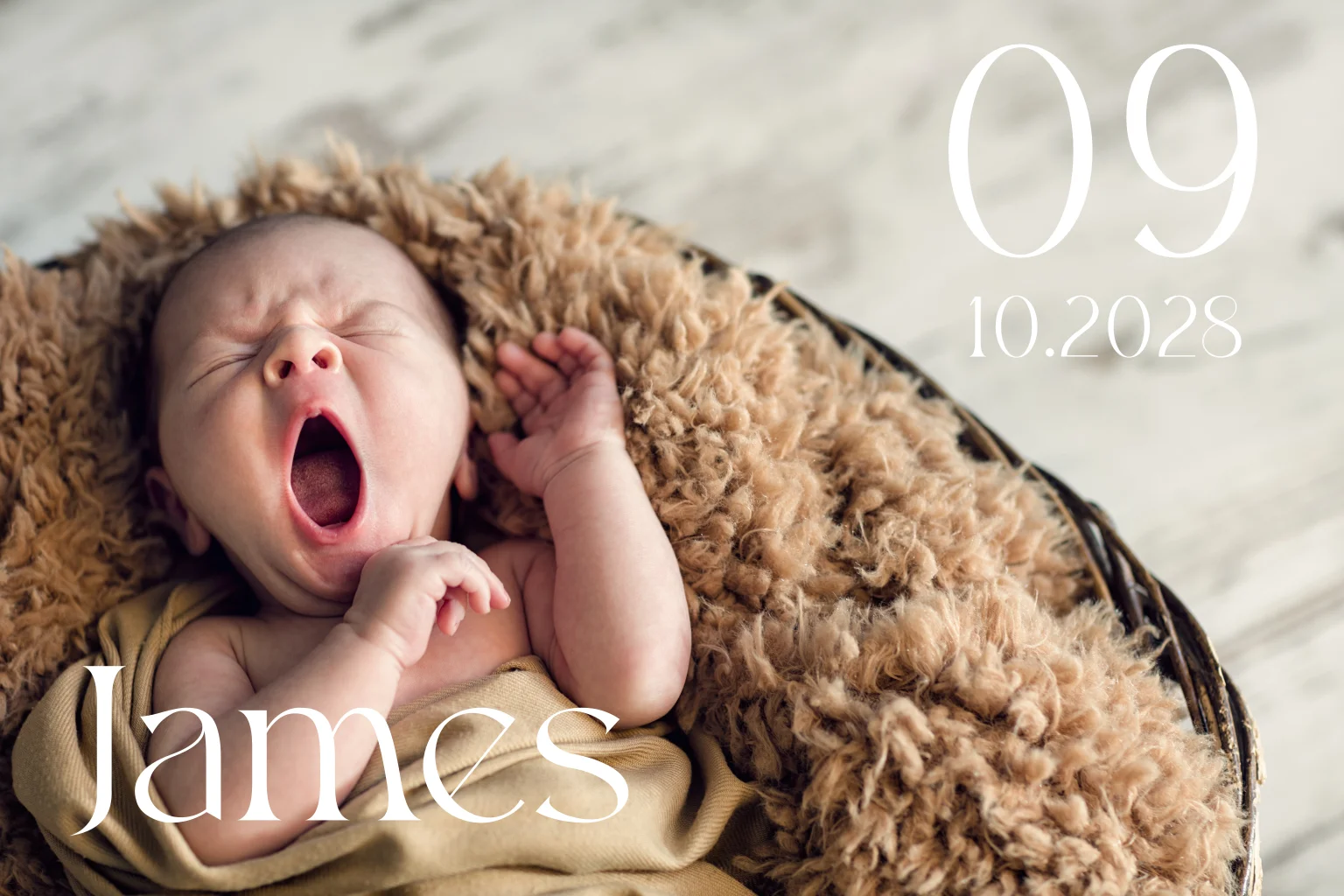 Schattig geboortekaartje met een foto van je pasgeboren kleintje. Pas gemakkelijk de naam, datum en andere elementen aan met de online editor!