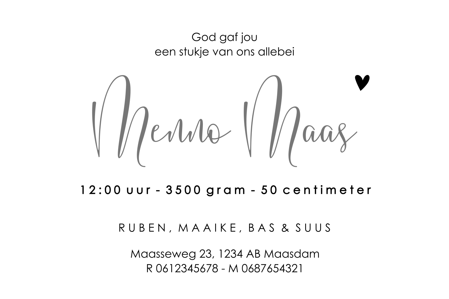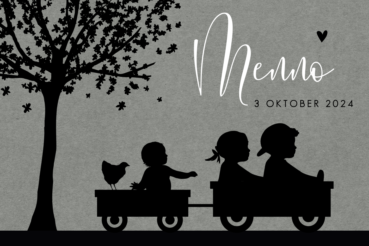 Stoer geboortekaartje om de komst van jullie derde kindje aan te kondigen. In kraft look grijs en de silhouetjes in zwart. In plaats van het kippetjes kun je ook een poesje plaatsen of een hondje. Heb je speciale wensen? Laat het ons weten: studio@madeformoments.nl