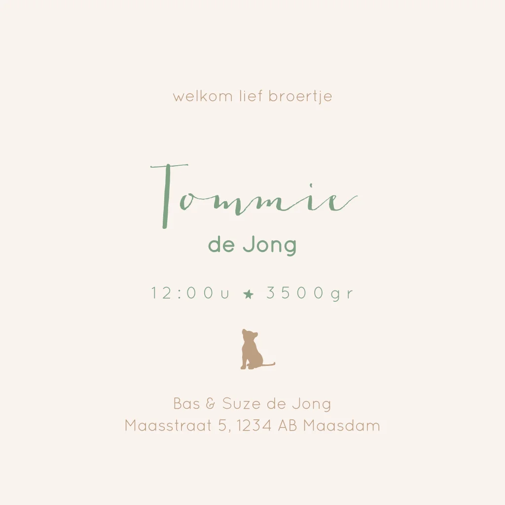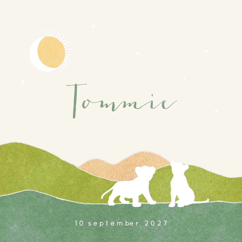 Wat een vrolijk kleuren groen op dit stoere geboortekaartje voor een jongen! In het heuvellandschap in verschillende kleuren groen gaan twee leeuwtjes in goudfolie op avontuur. Boven de naam in bijpassend lettertype en kleur straalt de zon, de tekst pas je eenvoudig zelf aan in de online editor.