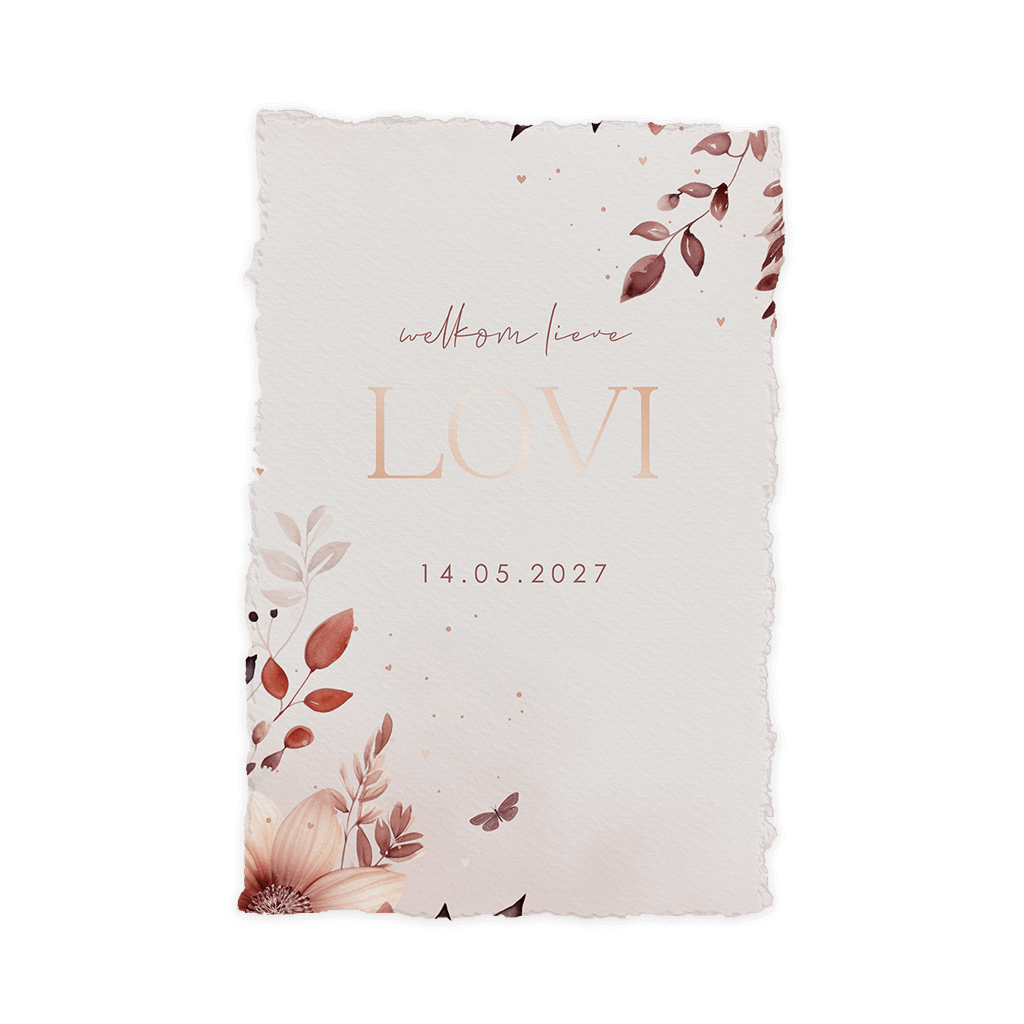 Wat bijzonder, een geboortekaartje met een handgeschept papier-look! De randen van het papier geven de kaart een authentiek en uniek uiterlijk. Je kunt het papier door middel van een speciale liniaal zelf scheuren om de handgeschepte look te bereiken. We raden je aan om onderstaande tips goed door te lezen voor het beste resultaat.