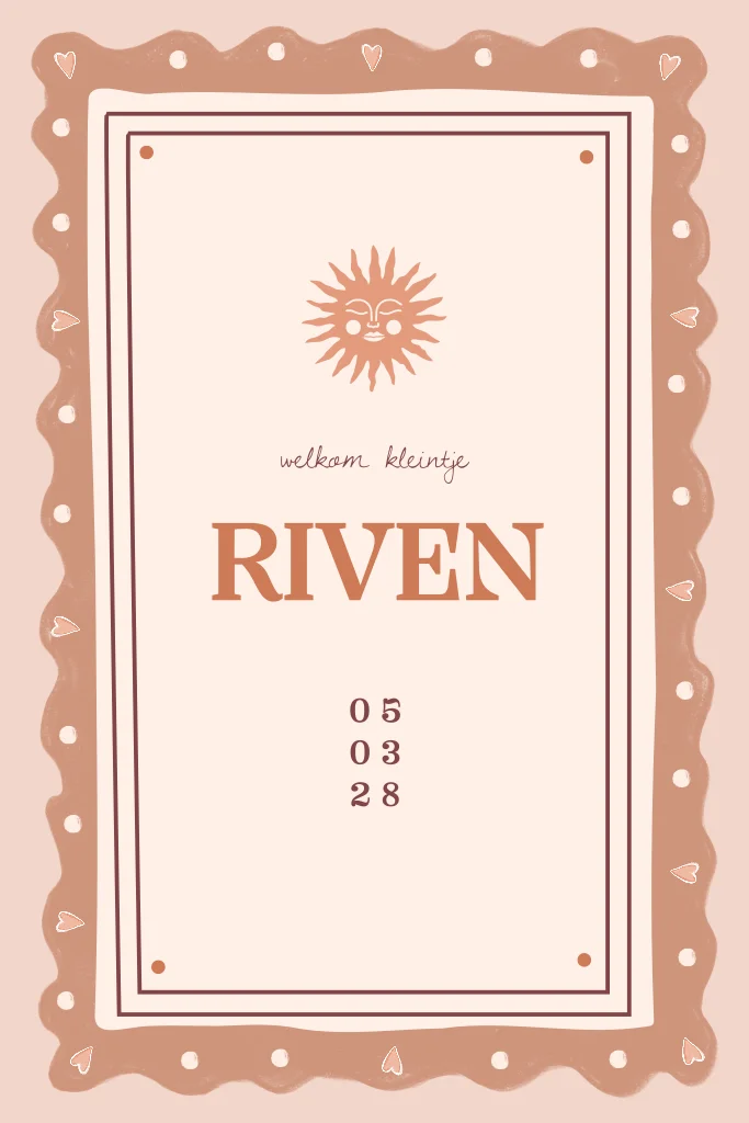 Zo schattig, dit bohemian geboortekaartje met zon en hartjes kader! Iets aanpassen? Dat doe je gemakkelijk met de online editor.
