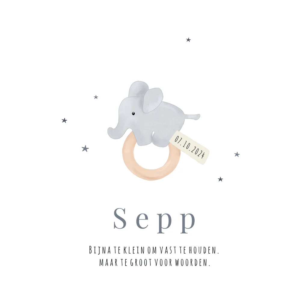 Ga voor bijzonder en kies voor een geboortekaartje waar de naam de hoofdrol speelt. De bijtring met olifantje en de ronde hoeken maken dit kaartje super lief.