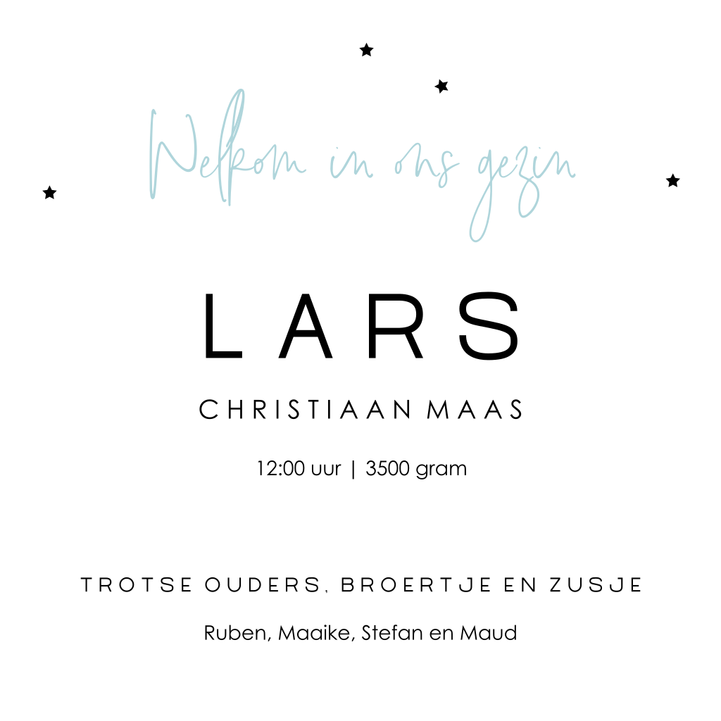 Een lief en hip kaartje om de geboorte van jullie derde spruit kenbaar te maken. Mooi op natuurkarton met een blauwe envelop.