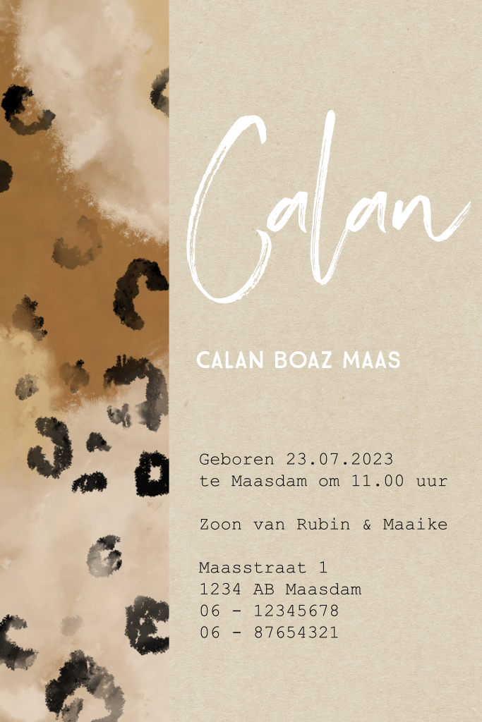 Kaartje geboorte zoon met panterprint. Stoer en volgens de laatste trends. Kies je lettertypes, plaats tekst en maak een proefdruk op oud-hollands.