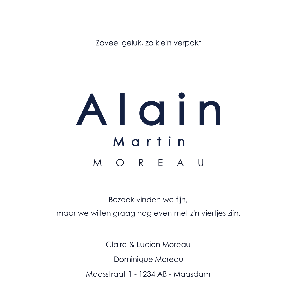 Zo ontzettend stoer dit donkerblauwe geboortekaartje! Een mooi lettertype die helemaal bij de kaart past. En wat de kaart zo bijzonder maakt? Het snorretje wordt gedrukt in goudfolie! Dat geeft het geboortekaartje een luxe uitstraling. Mooi met een gouden envelop.
