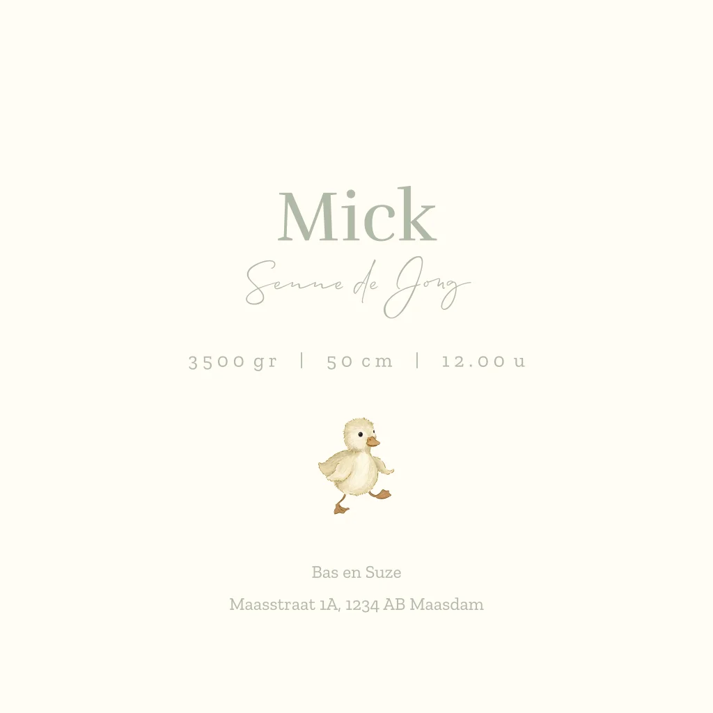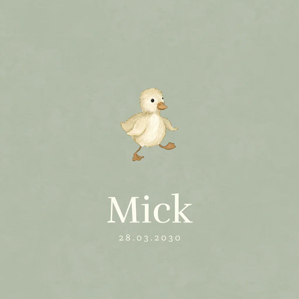 Hoe lief is dit groene geboortekaartje? Kies voor jullie kleintje een lief geboortekaartje met schattig eendje en maak het helemaal eigen door de achtergrond aan te passen naar je eigen favoriete kleur.