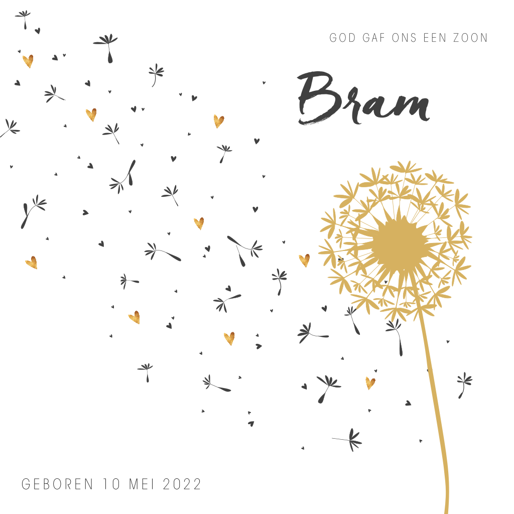 Hip en strak design geboortekaartje voor je zoon, met een paardenbloem in het goud waarvan de pluisjes weggeblazen worden.