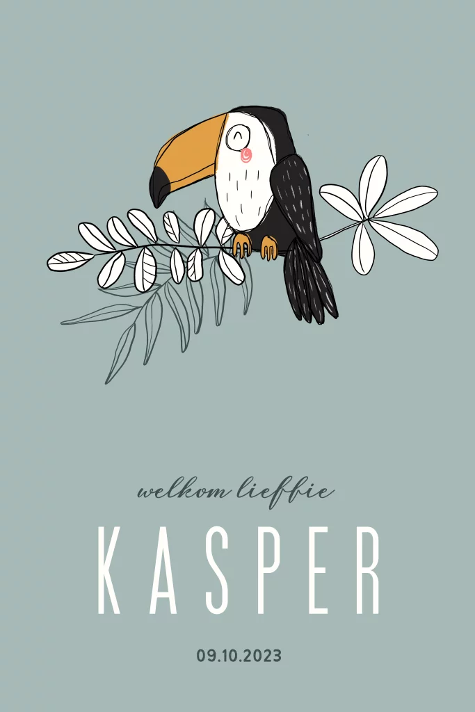 Avontuurlijk geboortekaartje jongen met twee stoere toekans! De achtergrond kleur pas je heel eenvoudig zelf aan in onze editor. Mooi op natuurkarton.