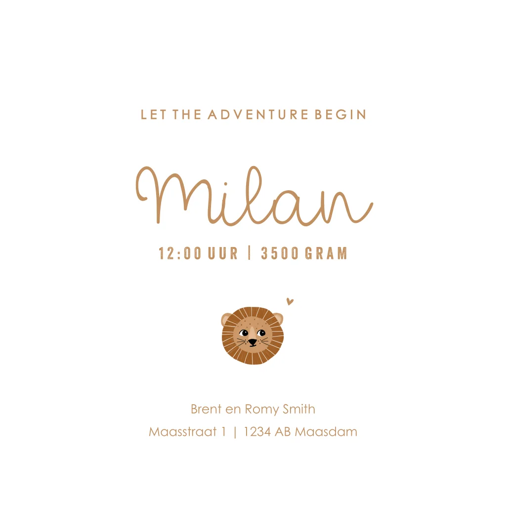 Op zoek naar een schattig geboortekaartje voor een jongen? Kies voor deze kaart met leeuwtje en ruimte voor eigen foto. Je past het ontwerp gemakkelijk aan in onze online editor. Wist je bijvoorbeeld dat het ook mogelijk is de letters en elementen in folie te drukken?