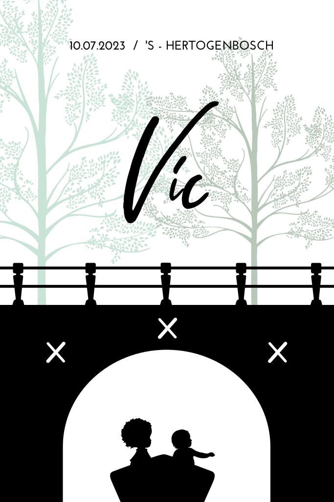 Kaartje geboorte zoon in stijl silhouet. Samen op avontuur op de Dieze. Grote broer die zijn kleine broertje meeneemt op een mooie rondvaart.