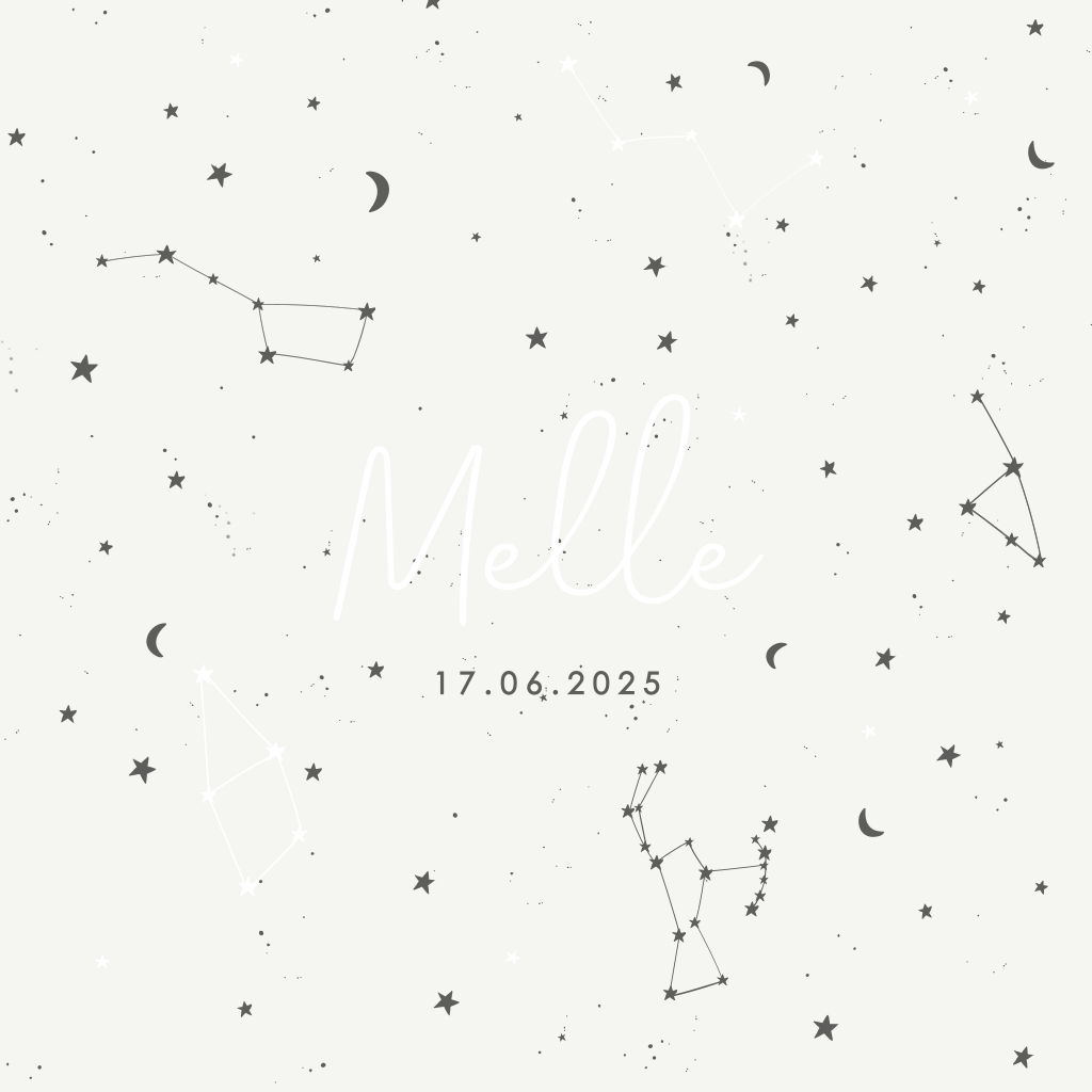 Een geboortekaartje volgens de laatste trends. Sterrenbeelden zijn niet meer weg te denken uit onze collecties. Wij hebben gekozen voor zilverfolie, liever een andere folie kleur? Dit kun je heel gemakkelijk zelf aanpassen!