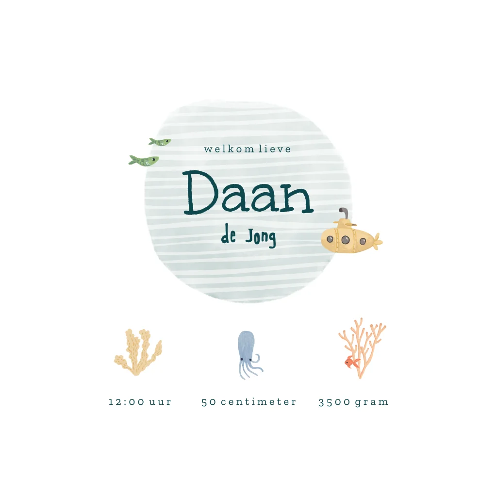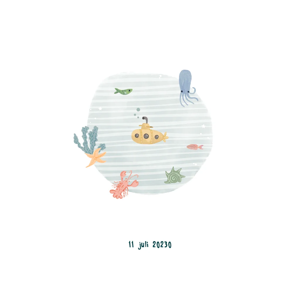 Kondig de geboorte van jullie kleintje aan met dit vrolijke geboortekaartje met duikboot en verschillende zeedieren! Het goudfolie geeft een luxe finish. Wil je een lettertype, kleur of ander element aanpassen? Dat kan gemakkelijk met de online editor.