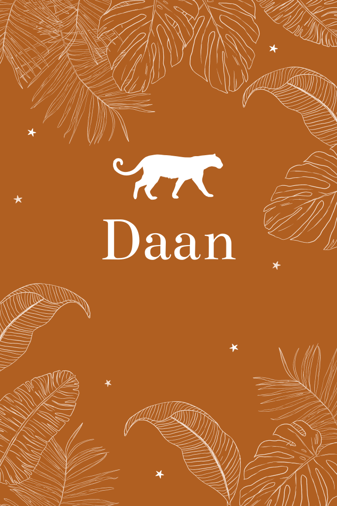 Uit de prachtige collectie van Kim Jacobs is dit prachtige jungle geboortekaartje ontstaan. Een design met prachtige natuurlijke kleuren. De toevoeging van de panter en naam in goudfolie maakt dit kaartje extra bijzonder.