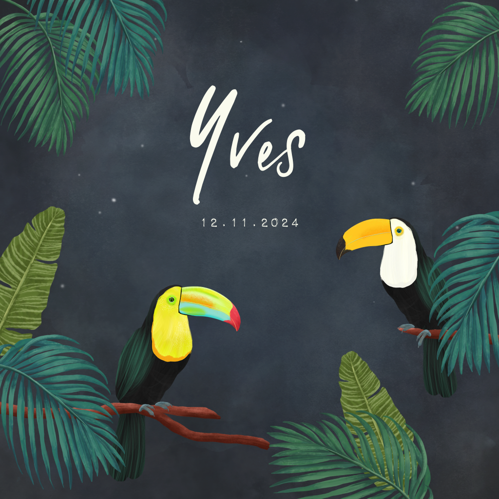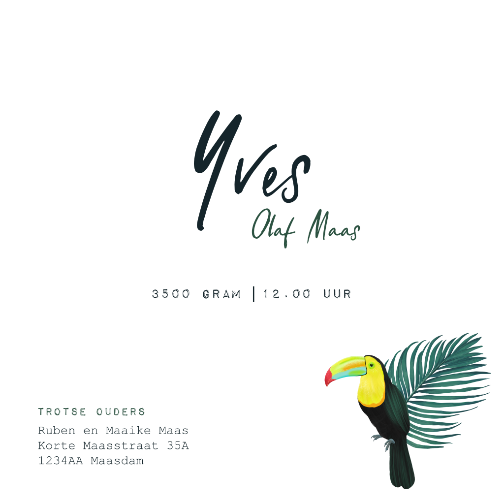 Een avontuurlijk geboortekaartje jongen in jungle stijl. Twee prachtige toekans geïllustreerd door onze vormgevers. Maak het kaartje compleet met jullie gegevens.