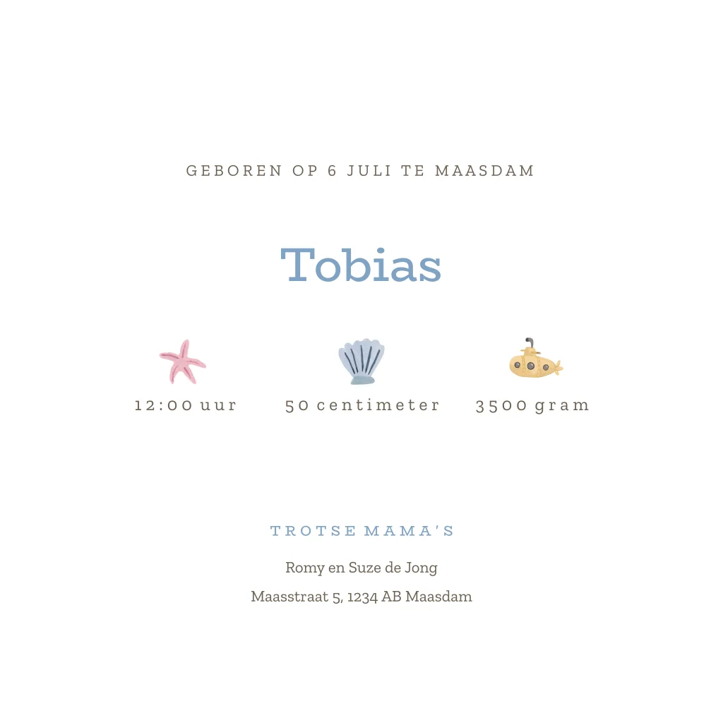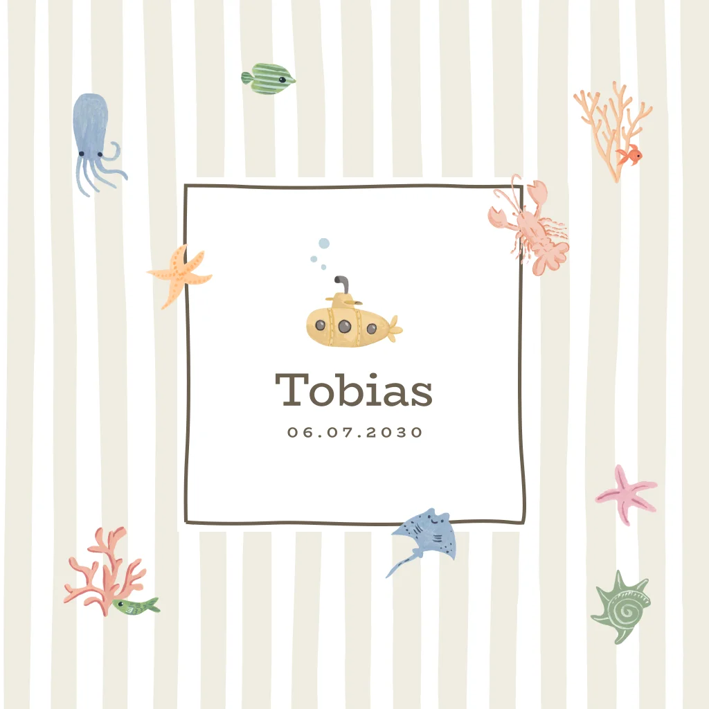 Kondig de geboorte van jullie kleintje aan met dit vrolijke geboortekaartje met streeppatroon, duikboot en verschillende zeedieren! Wil je een lettertype, kleur of ander element aanpassen? Dat kan gemakkelijk met de online editor.